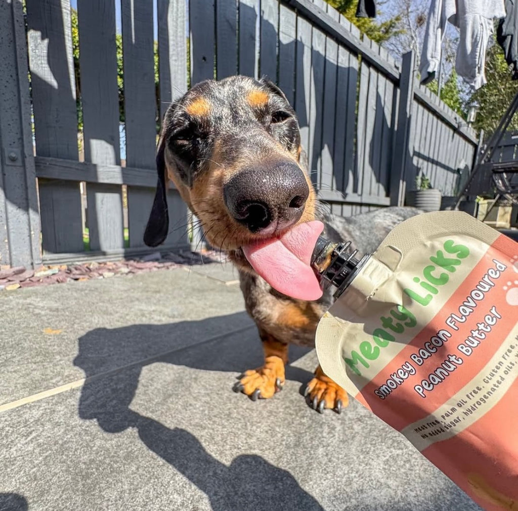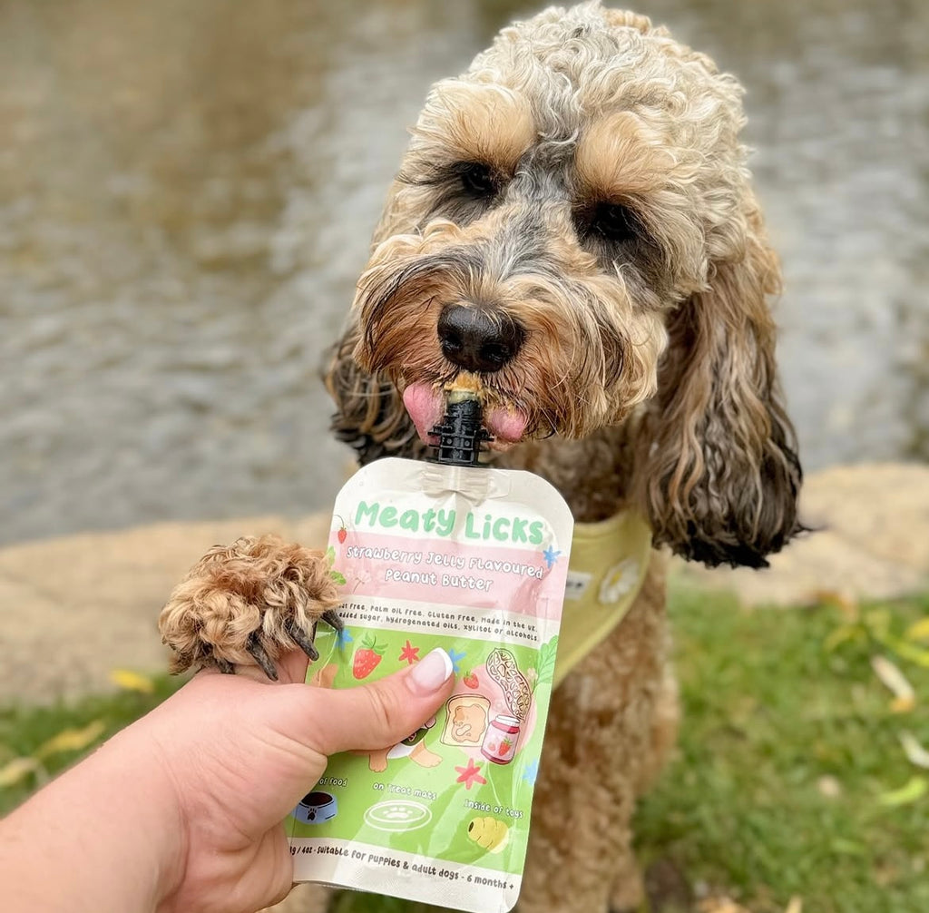 Meaty Licks – ett premium jordnötssmör för hundar, tillverkat i Wales. Veganskt, glutenfritt och gjort på råvaror av högsta kvalitet. Perfekt för känsliga magar eller hundägare som vill ha ett växtbaserat alternativ.