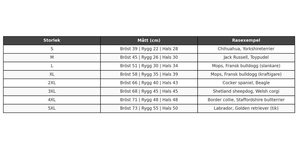 Storleksguide med rasexempel hittar du i tabellen bland bilderna.