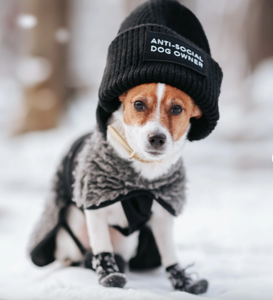 Gör dig redo att bli den mest stilfulla och osociala hundägaren med vår svarta ullmössa ”Anti-Social Dog Owner”. Den håller dig varm under kyliga promenader och äventyr med din hund. Tillverkad i en kvalitativ ullblandning. Denna trendiga mössa kan även enkelt matchas med din hunds halsband och koppel.
