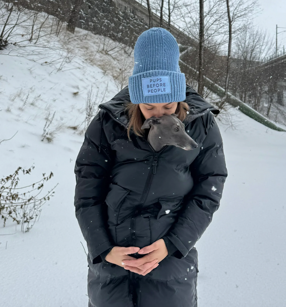 Lägg till lite hund charm till din vintergarderob med vår trendiga blå mössa. Tillverkad av varm ull och med det lekfulla citatet "Pups Before People". Denna mössa är ett måste för alla kalla dagar ute med din lurviga vän. Lyft din vinterlook med denna perfekta beanie, så att du håller dig både snygg och varm under hela vintern.